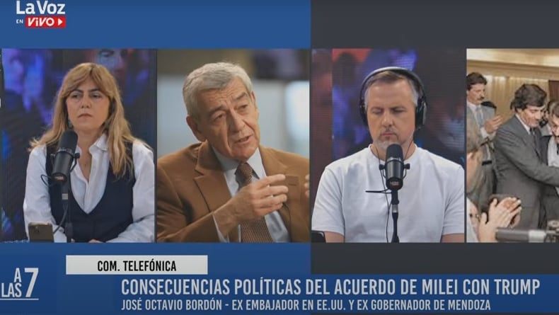 Siguen las repercusiones luego del fuerte respaldo que recibió en estos días el presidente argentino, Javier Milei, por parte del gobierno de Estados Unidos, sobre todo de su par, Donald Trump.En ese marco, el exembajador argentino en ese país, José Octavio Bordón, dijo a La Voz En Vivo que estamos en una transición de un hecho al que calificó de “importante e inédito”. “El presidente Trump ha inaugura algo inédito en la politica internacional, donde los amigos son los amigos y enemigos son enemigos. Esto es parte del desorden internacional que existe hoy”, remarcó. “Estamos en una transición de un hecho que es importante, es inédito y los analistas dicen que no recuerdan algo similar a esto, sobre todo lo que hizo el secretario del Tesoro, Bessent”, agregó.“Esto genera también una estabilidad, pero también está la pregunta de que si la gente no le genera un triunfo a Milei en las elecciones que vienen qué va a pasar”, dijo Bordón.Lo que ha salvado a la situación grave que vivimos la semana pasada en la Argentina, no es la política económica delgobierno de Milei, lo salvó la la política tan detestada por él, más concretamente la geopolítica”, consignó.“No estoy en contra ni a favor que se habilite este préstamo quiero saber qué pasa después de los seis meses en que se terminen las condiciones”, dijo. “Espero que el presidente reflexione cuáles han sido sus aciertos y cuáles son sus errores después de esto. Y no es un problema de querer desestabilizar o no”, finalizó.La Voz