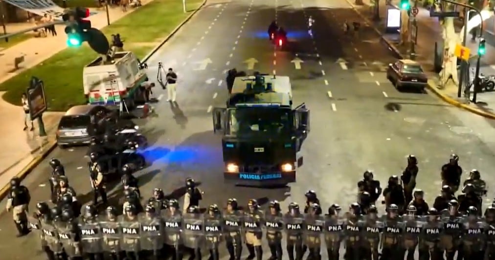Distintas señales de televisión lograron captar uno de los momentos más álgidos de la conflicto en el Congreso cuando un pequeño grupo de hombres levantaron una muro improvisado y se dispusieron a armar bombas molotov, que lanzaron a los uniformados. Una vez más, los agentes de las fuerzas de seguridad intentaron detener el avance con hidrantes.